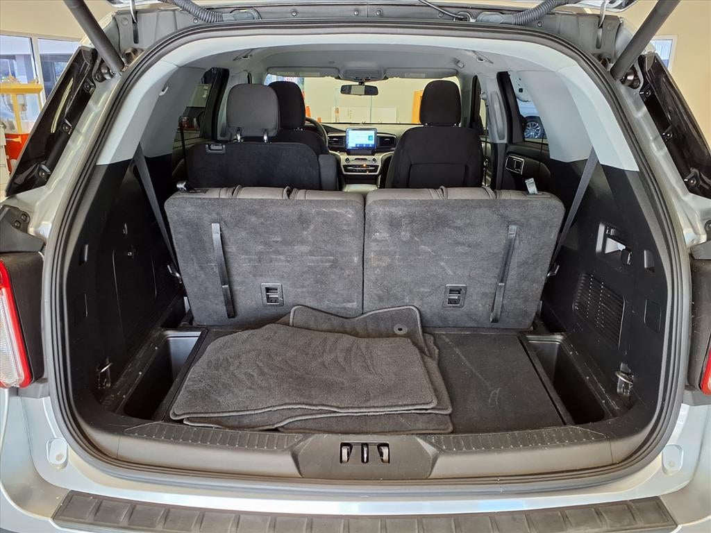 Equipped with Equipment Group 200A, Explorer XLT, 4D Sport Utility, 2.3L EcoBoost I-4, 10-Speed Automatic, RWD, Iconic Silver Metallic, Ebony w/Unique Cloth Captain's Chairs, 1st Row Heated Seats, 3.58 Non-Limited-Slip Rear Axle Ratio, 3rd row seats: bench, 4-Wheel Disc Brakes, 6 Speakers, ABS brakes, Air Conditioning, Alloy wheels, AM/FM radio: SiriusXM, AM/FM Stereo, Auto High-beam Headlights, Auto Start-Stop Removal, Automatic temperature control, Brake assist, Bumpers: body-color, Compass, Delay-off headlights, Driver door bin, Driver vanity mirror, Dual front impact airbags, Dual front side impact airbags, Electronic Stability Control, Emergency communication system: SYNC 3 911 Assist, Exterior Parking Camera Rear, FordPass Connect, Four wheel independent suspension, Front anti-roll bar, Front Bucket Seats, Front Center Armrest, Front dual zone A/C, Front reading lights, Fully automatic headlights, Heated door mirrors, Heated front seats, Illuminated entry, Knee airbag, Leather steering wheel, Low tire pressure warning, Occupant sensing airbag, Outside temperature display, Overhead airbag, Overhead console, Panic alarm, Passenger door bin, Passenger vanity mirror, Power door mirrors, Power driver seat, Power Liftgate, Power passenger seat, Power steering, Power windows, Rear air conditioning, Rear anti-roll bar, Rear Auxiliary Controls Credit, Rear reading lights, Rear window defroster, Rear window wiper, Remote keyless entry, Roof rack: rails only, Security system, Speed control, Speed-sensing steering, Speed-Sensitive Wipers, Split folding rear seat, Spoiler, Steering wheel mounted audio controls, SYNC 3 Communications & Entertainment System, SYNC 3/Apple CarPlay/Android Auto, Tachometer, Telescoping steering wheel, Tilt steering wheel, Traction control, Trip computer, Unique Cloth Captain's Chairs, Variably intermittent wipers, and Wheels: 18 5-Spoke Silver-Painted Aluminum.